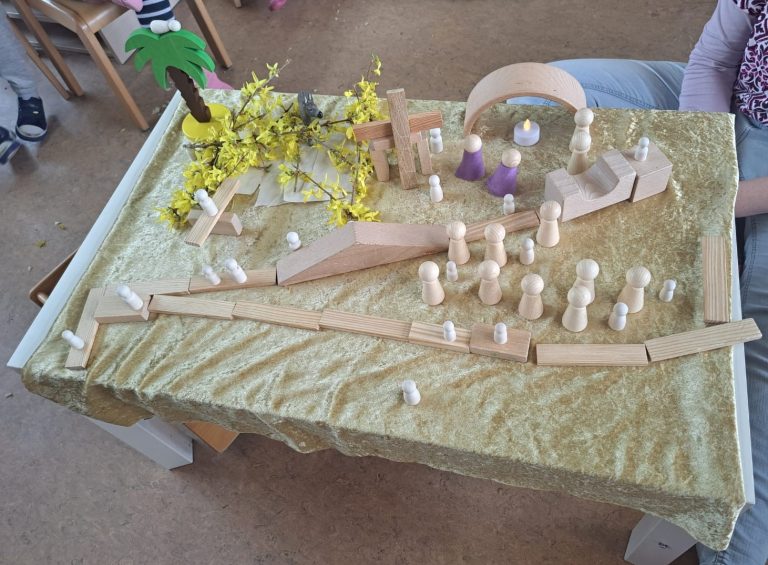 Es geht um die biblische Darstellung der Geschichte – die Heilung des Blinden Bartimäus. Hierbei habe ich einfach Erzählfiguren & ein Tuch benutzt.